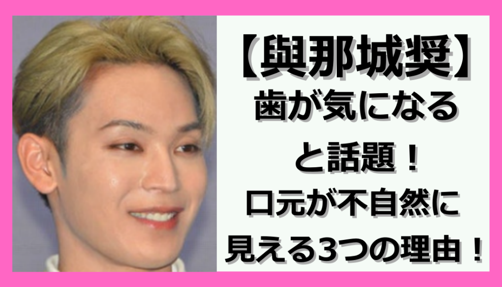 ダンスボーカルグループの「JO1」のメンバー、與那城奨(よなしろしょう)さん。 整ったお顔立ちと笑顔も可愛いことで人気を集めています。 しかし、與那城奨さんについて「歯が気になる」「笑った時の口元に違和感がある」という声もあるようです。 一体な... -