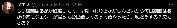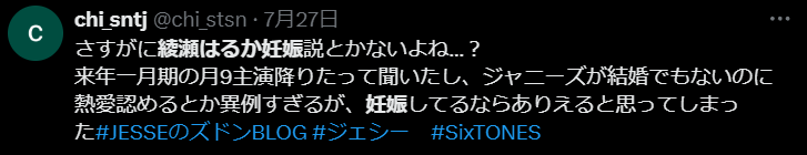 また、「悪阻の綾瀬はるかさんをジェシーがお世話しているのでは?」との声もあり、ファンの間では「妊娠説」はさらに広がっているようです。