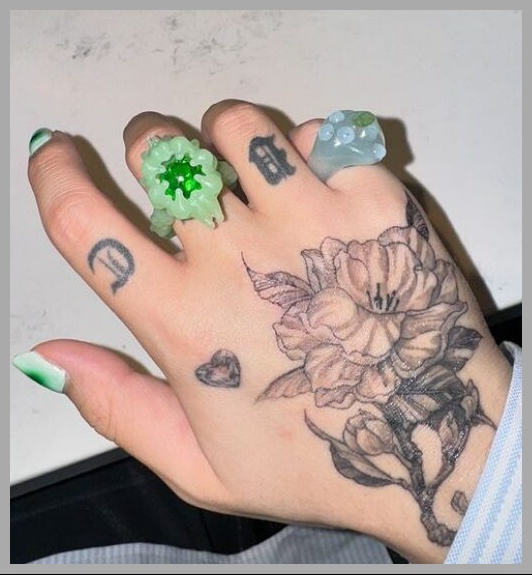 鏡に映っている写真なので反転しているためタトゥーは右の指に入っています。