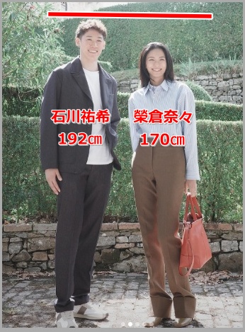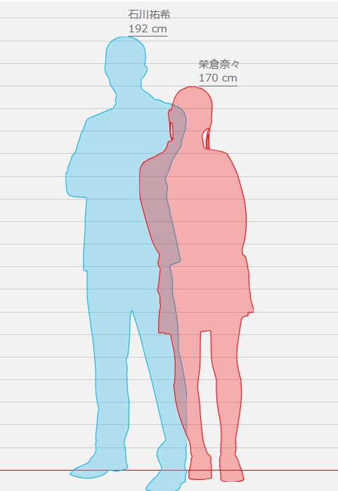 身長比較ツールの画像を見ると、身長170㎝の榮倉奈々さんの頭の先が身長192㎝の石川祐希選手の首元辺りにあります。