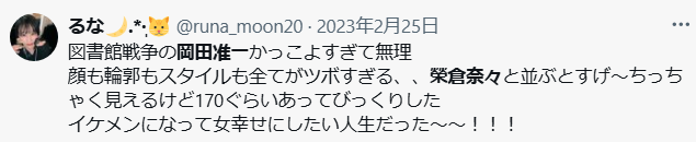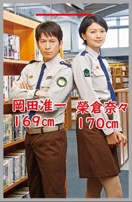 足元がわからないのですが、たぶん榮倉奈々さんはヒールのある靴を履いてらっしゃるのでしょう、岡田准一さんより10㎝近く高いように見えます。