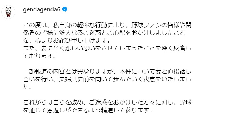 自身のインスタグラムにも、謝罪文を掲載しました。