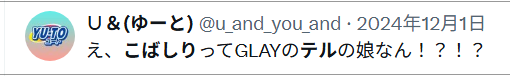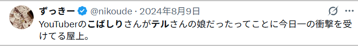 「こばしり。」の兄のツイッターには、誕生日に〈ハピバー!!〉、音楽の動画を投稿したという報告に〈めちゃくちゃ良いじゃん!〉と、TERU自身がコメントを寄せている。さらに、「こばしり。」のフェイスブックのアカウントを確認すると、兄のほか、TERUの前妻、そのうえ「小橋照彦」その人の名もあるのである潮。引用元:デイリー新潮