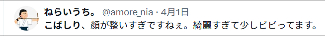 顔がロックバンド“GLAY”のヴォーカル、TERUに似ているのは話題になっていましたけど、“こばしり。”のツイッターを辿ると、前職は自由が丘の美容院のカットモデル。その時の名が小橋明里。TERUの本名は小橋照彦なんです。今年21歳で、兄がいて、新潟出身のシングルマザーの下で育ったこともわかった。また、お兄さんは今年25歳で、GLAYの音楽を聞いている