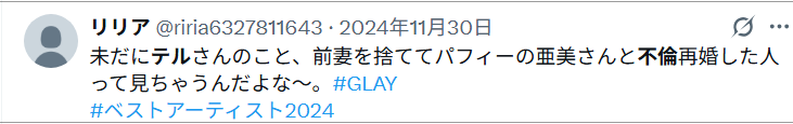 私はこのとき、初めてTERUくんの恋人の存在を知った。そして彼女のことを、「なるほど、やっぱりTERUくんが好きになるだけの女性だわ」と感心した。引用元:『 私の中のGLAY 』清水由貴著