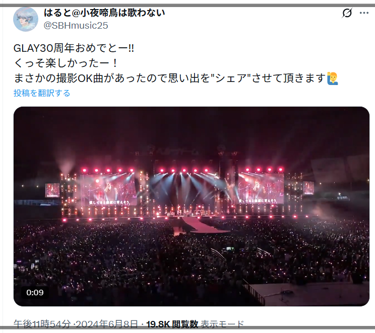 また、晴時さんが、GLAYのライブに行っている様子も確認できました↓