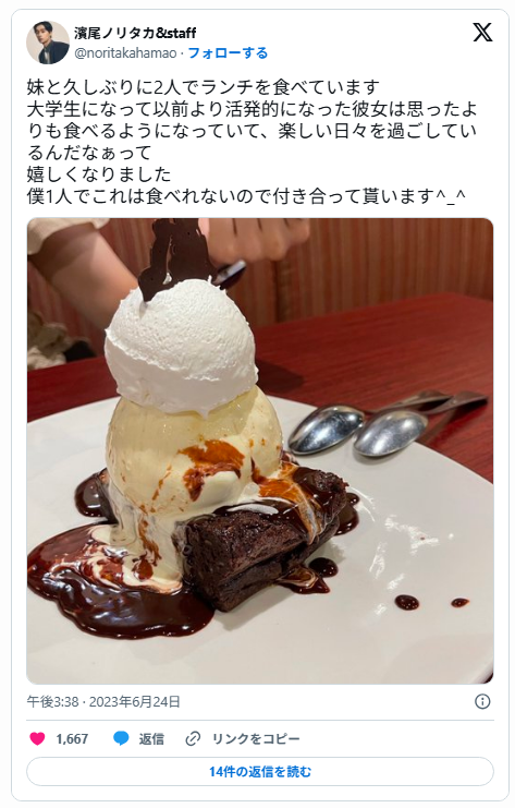 と投稿し、妹の成長を喜ぶ兄としての一面を見せていました。