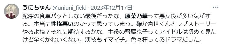 原菜乃華さんの性格については、2023年10月に出演したドラマ「泥濘の食卓」が関係しているようです。