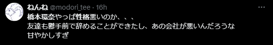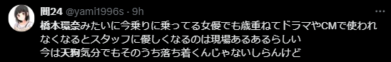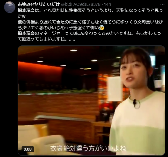 2024年10月30日に「週刊文春」が報じた内容によると、橋本は撮影現場でマネージャーに対して激しい暴言を吐くなどの行動があったとされています。