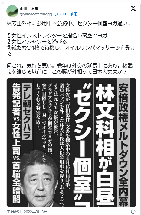 林芳正議員は、2018年4月にセクシーヨガ通いが報じられました↓
