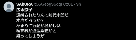 けがは軽傷のようですが、広末涼子さんは事故現場で立ったり座ったり、不審な動きが見られたとか。