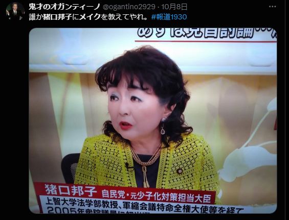 猪口邦子議員のメイクスタイルは、その特徴的な要素から様々な議論を呼んでいます。