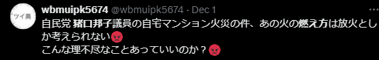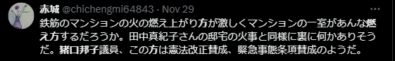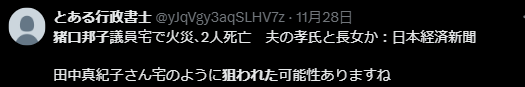 猪口邦子議員の政治的立場や、火災発生時の状況の特異性から、「単なる事故ではないのでは?」という声が上がっています。