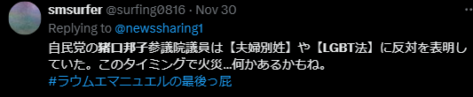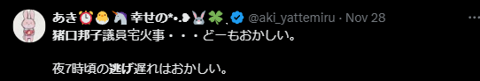 しかしながら、SNS上では事件の異常性を指摘する声が相次いでおり、特に猪口議員の政治的立場との関連性を疑問視する意見も見られるようです。