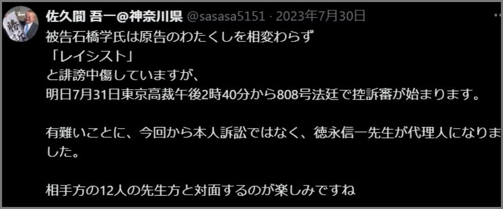 佐久間氏は裁判結果に、「残念。取材と称する演説妨害行為」とコメント。