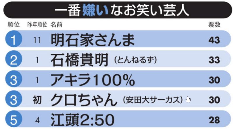 石橋貴明さんは、「嫌いなお笑い芸人ランキング」でも、トップにランクインしています。