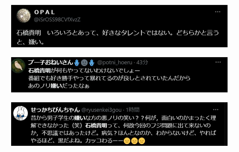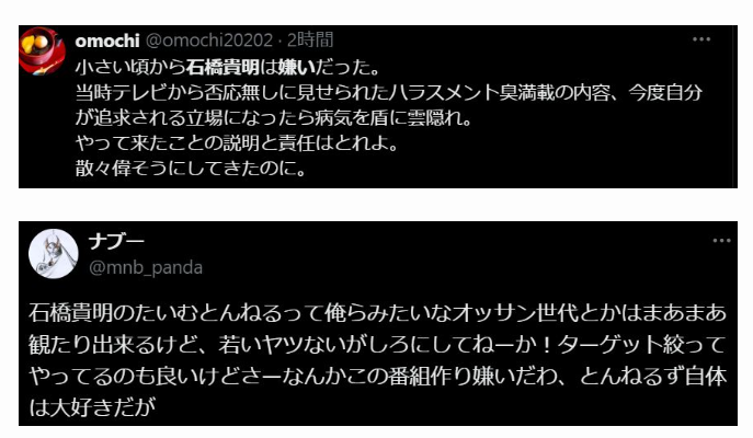 石橋貴明さんについては、「嫌い」という声が多々あがっているようですね。