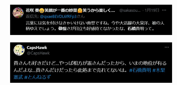 また、木梨憲武さん2人でいた「とんねるず」が面白かったので、石橋貴明さん単独だと物足りないと感じてしまうようです。