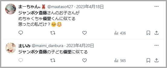 Xでは斎藤メンバーのお子さんが優里さんにそっくりという声もあがっていました。