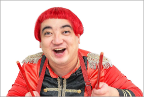 ユニークな衣装と髪をしたマーチングバンドの扮装でスネアドラムをたたきながら登場し、「デッカチャンだよ」で始まります。