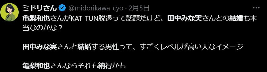 亀梨和也さんといえば、2024年元旦にフリーアナウンサー・田中みな実さんとの交際が報じられました。