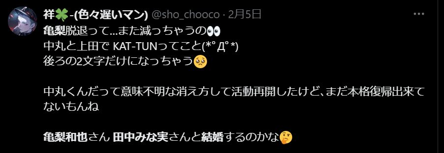 しかし亀梨和也さんはすでに事務所を退所しているので、あくまで憶測にすぎません。