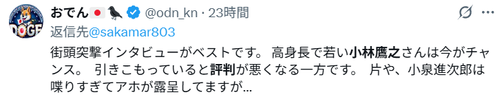 ”コバホーク”とも呼ばれ、次期総理大臣として名前が上がっている人気政治家ですね。