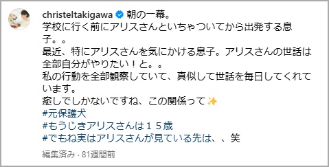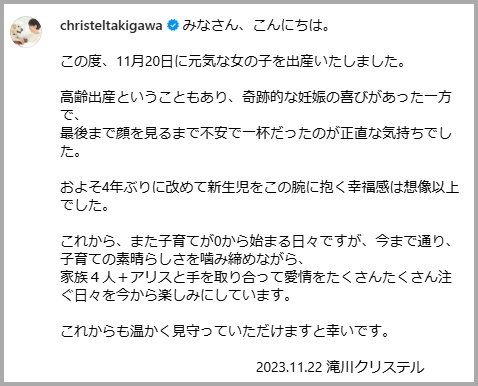 妻・滝川クリステルさんは、2023年に第二子が誕生したことを自身のインスタグラムでこのように報告していました↓
