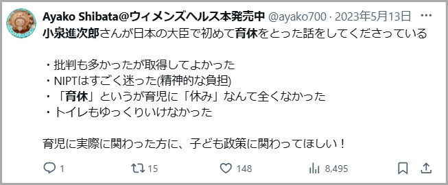 結果として小泉さんは最も母親の負担が大きいと言われる出産から3ヶ月間の中で「2週間分」取得していました。