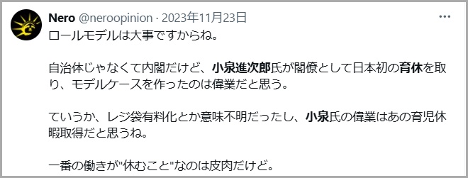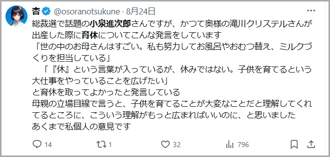 小泉進次郎さんの育児休暇に関してネットでは、下記のように称賛されていました↓