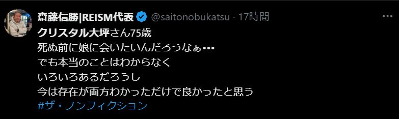 クリスタル大坪さんは、フジテレビの人気ドキュメンタリー番組『ザ・ノンフィクション』に出演しました。