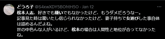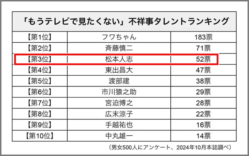 また、「FRASH」のアンケートによると、「もうテレビで見たくない」不祥事タレントランキングで、松本人志さんは