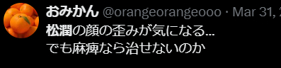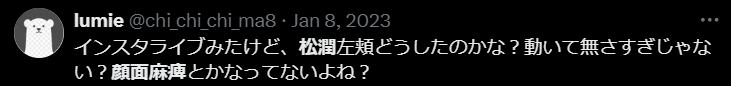 松本潤さんの口元の歪みについて気になっている方からは、「顔面麻痺」が原因ではないかと言われています↓