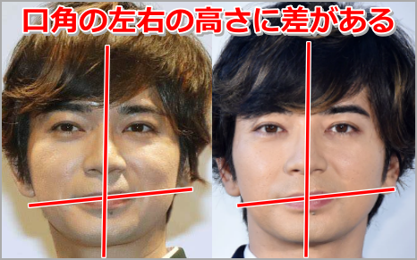 松本潤さんのお顔にラインを引いてみると、中心から口角の左右の高さに差があり左側に歪んでいることが分かります。