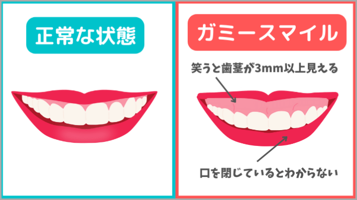具体的には笑った時の歯茎の露出が3mmを超えると、ガミースマイルだと判断されます。