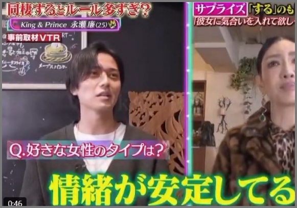 永瀬廉さんは、2025年1月の「トーククイーンズ」に出演した際、好きなタイプを明かしていました。
