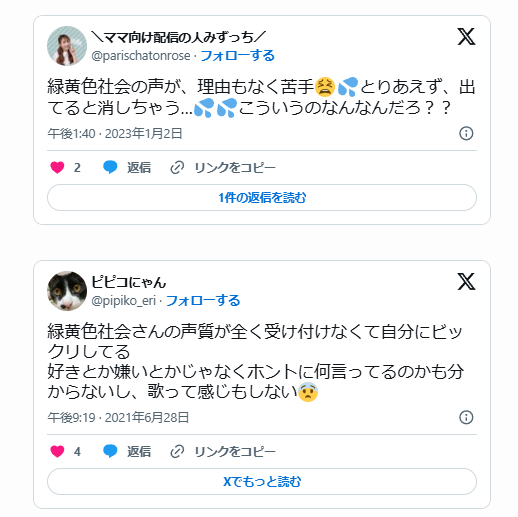 また、独特の音色や声の張り方が、聴く人によっては違和感を覚える要因となっているようです。
