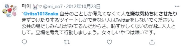 『自分のことしか考えてなくて人を嫌な気持ちにさせたり傷つけたりするツイートしかできない人はTwitterをしないでください。(中略)女々しいやつは嫌いです』