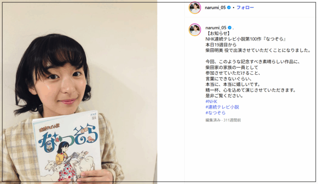 主人公なつ(広瀬すず)を引き取った柴田家の妹・明美役を演じ、天然で愛らしいキャラクターで多くの視聴者の心を掴んでいます。