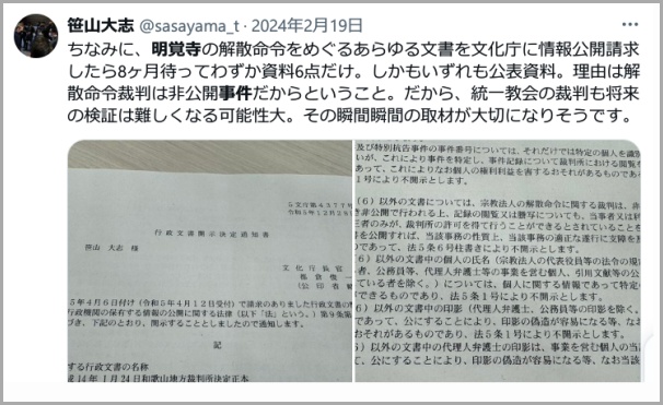 これを受けて1999年12月16日に、文化庁は「組織ぐるみの違法性が認められる」として和歌山地方裁判所に宗教法人明覚寺に対する解散命令を請求しました。