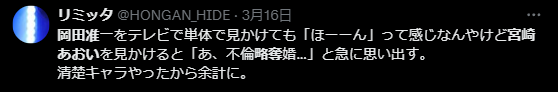 高岡さんは、不倫が原因であることを主張し、宮崎さんの好感度は一時的に急落。