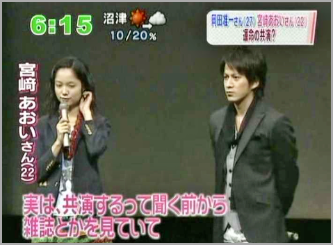 『陰日向に咲く』の舞台挨拶で宮崎が「実は(岡田と)共演するって聞く前から雑誌とか見てて、急に手が止まる存在になっていて。なんでだろうと思ってたら、『今度映画でご一緒だよ』という話を聞いて、そんなことが初めてだったので、びっくりはしたんですけど」と話していたと紹介。