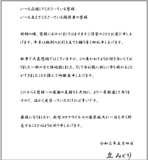 丘みどりさんは2019年8月14日、自身のブログに「結婚しました」という記事を投稿。