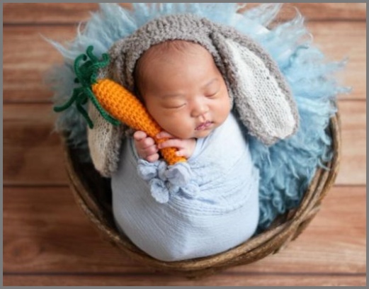 ニューボーンフォトでは、第一子ではくま、第二子ではウサギをイメージして写真をアップ。