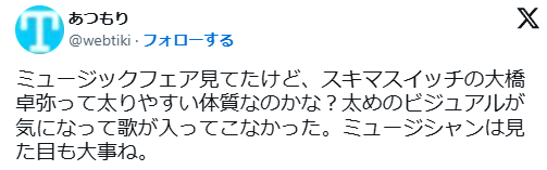 このように、大橋卓弥さんが「太り過ぎ」という声が、多数ありました。