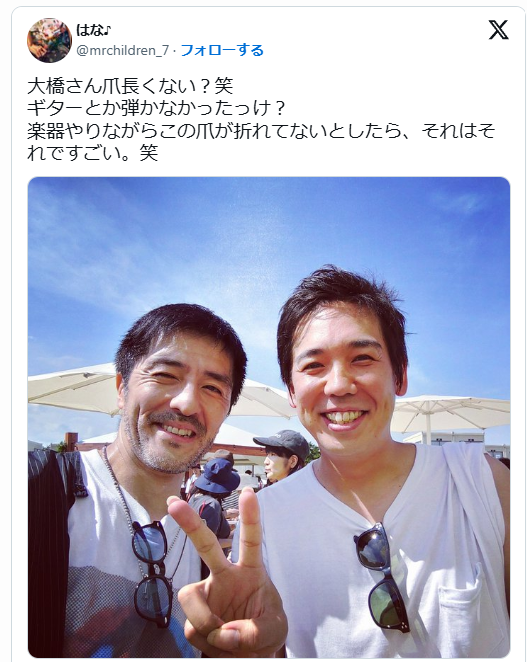 ピックを使用せず爪弾きをすることでくっきりした音を出しやすいメリットがあるため、大橋卓弥さんは爪を伸ばしているのかもしれませんね。