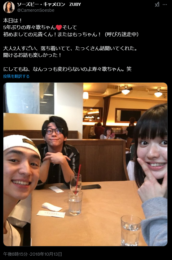 そして、鎮西寿々歌さんと同じく、元天才てれびくんで共演していたソーズビー・キャメロンさんのSNS上での投稿から、3人での食事が初対面ということがわかります。