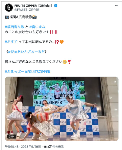 鎮西寿々歌さんの所属グループ「フルーツジッパー」の公式アカウントにて、鎮西寿々歌さんの転倒トラブルがありました。