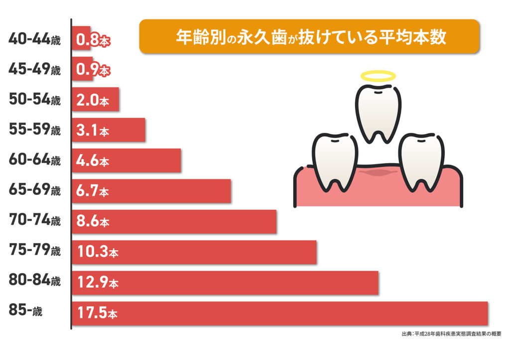 均的に歯を初めて失うのは50歳頃ということで、年齢に伴う歯の減少は十分考えられますね。