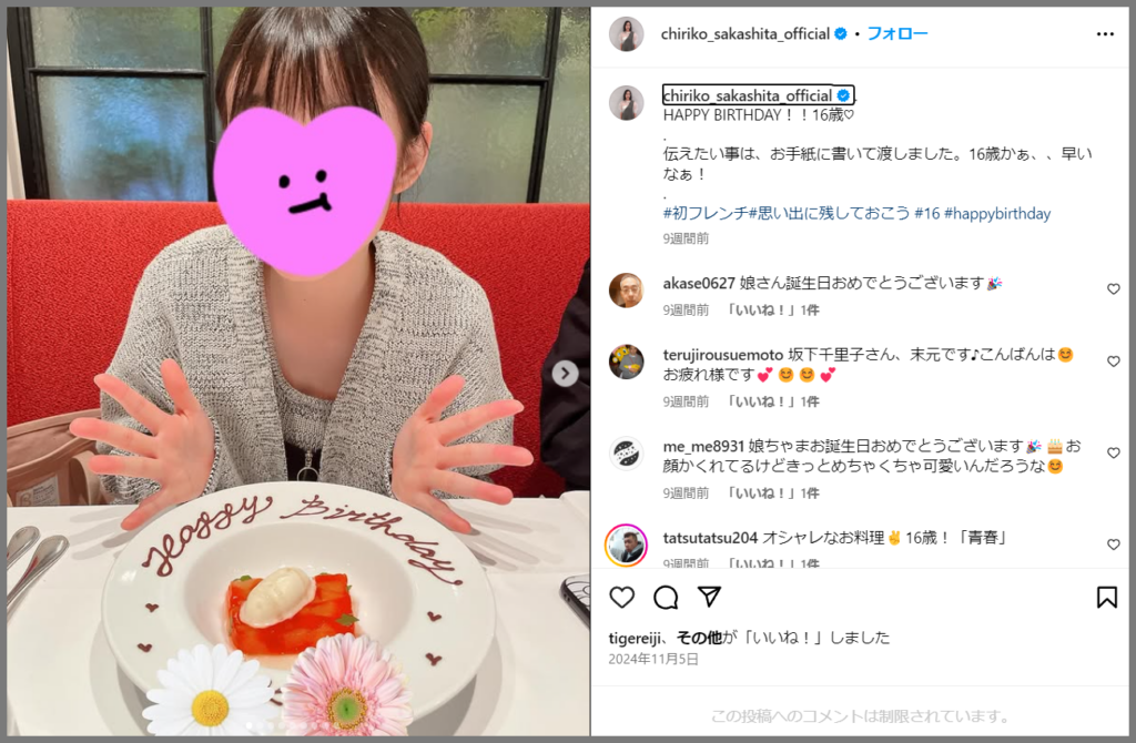 現在の顔写真については、長女の誕生日を祝っている時の様子が坂下千里子さんのSNSにアップされていました。